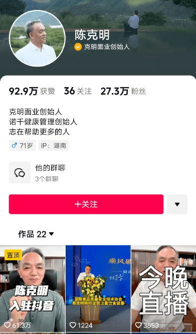 就在今年7月10日,陈克明入驻抖音并发了第一条视频,播放迅速破千万,视频中其表示虽然已经72岁但“内心感觉还是27岁”,并表示“有生之年要再做一家上市公司”。从陈克明抖音账号的介绍来看,除了“克明面业创始人”,还写着“诺千健康管理创始人”。