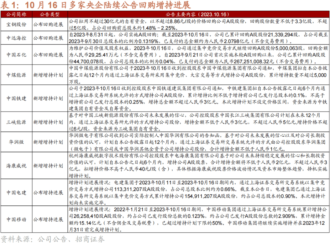 10月16日,10家央企陆续公告增持回购进展, 上市公司回购规模回升。其中,5家上市公司公布新增增持计划,约5亿~16.3亿元;2家上市公司公布增持进展,合计约23.43亿元;1家上市公司新增回购计划,不超过30亿元;2家上市公司公布回购进展,合计4.75亿元。此外,10月16日晚间还有16家科创板公司披露回购、增持、承诺不减持等以真金白银传递信心的公告。本次回购增持多为大市值央企公司,其增持、回购规模较大,有望起到标杆和引领作用,推动市场预期提升和引领更多公司开展回购增持。