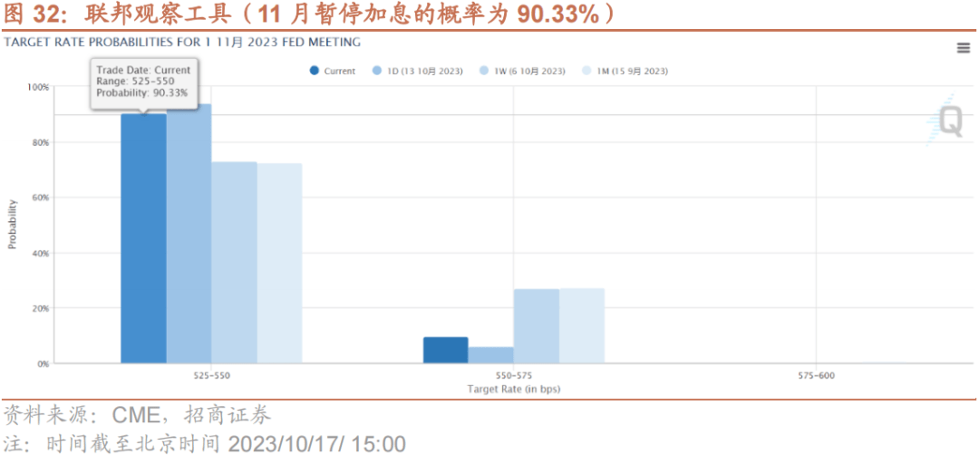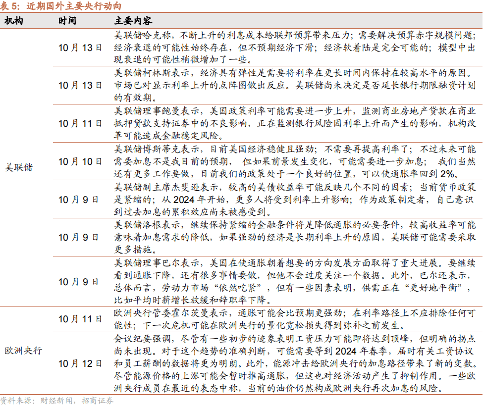 10月以来,多位联储官员就货币政策看法发声,从月初偏鹰派声音到近期多位官员释放鸽派信号。多位美联储官员表示近期美国长期国债收益率大幅上涨,可能会抵消美联储进一步提高政策利率的必要性。达拉斯联储主席洛根和美联储副主席杰弗逊均在讲话中强调了解收益率上升与适当货币政策关系非常重要。洛根表示“如果长期利率因期限溢价上升而保持较高水平,那么进一步加息的必要性可能会降低”。美联储副主席杰弗逊表示“在评估未来利率路径时将考虑到较高的债券收益率”。