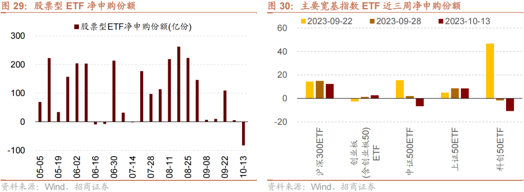上周(10/9-10/13)ETF净赎回,当周净赎回82.4亿份,宽指ETF申赎参半,其中沪深300ETF申购较多,科创50ETF赎回较多;行业ETF申赎参半,其中军工ETF申购较多,医药ETF赎回较多。具体的,沪深300ETF净申购12.3亿份;创业板ETF净申购2.7亿份;中证500ETF净赎回6.7亿份;上证50ETF净申购8.5亿份。双创50ETF净申购2.7亿份。科创50ETF净赎回10.8亿份。行业ETF方面,信息技术行业净赎回27.0亿份;消费行业净赎回6.4亿份;医药行业净赎回29.8亿份;券商行业净申购1.3亿份;金融地产行业净赎回3.1亿份;军工行业净申购9.2亿份;原材料行业净赎回0.6亿份;新能源&智能汽车行业净申购6.3亿份。