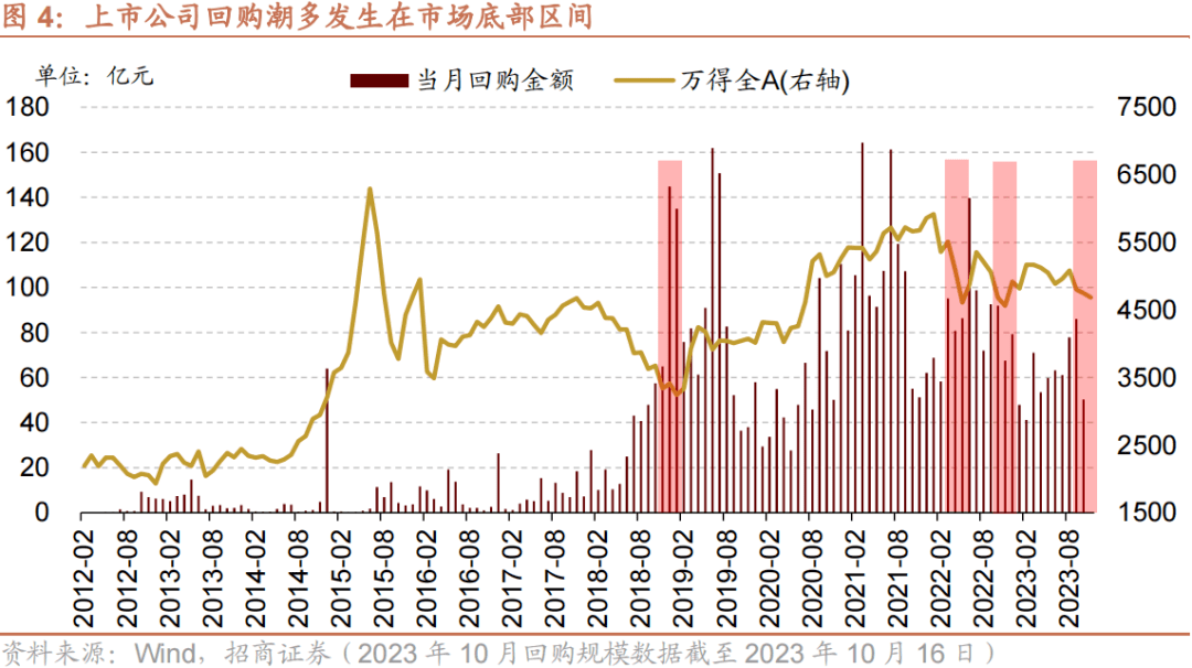 历史上回购潮基本同步或略有领先市场底,近期回购活跃度再度提升。2018年10月19日,市场第一次见底后11月至12月上市公司回购规模大幅提升,2月内市场区间回购金额达210亿元,且持续回购至2019年1月,随后市场在2019年1月3日第二次见底回升,期间间隔54个交易日。2022年4月26日,受疫情影响市场第一次见底,2022年3月份回购规模再度上升至95亿元,9月-10月达到第二个回购规模高点,市场同样于10月31日见底回升,期间间隔125个交易日。由此可见,回购潮基本同步或略有领先市场底。近期上市公司回购持续发力,2023年9月以来,A股市场已有近375家上市公司参与股份回购,上市公司股票回购规模达136亿元,年内总回购金额达612亿元,股份回购活跃度持续提升。