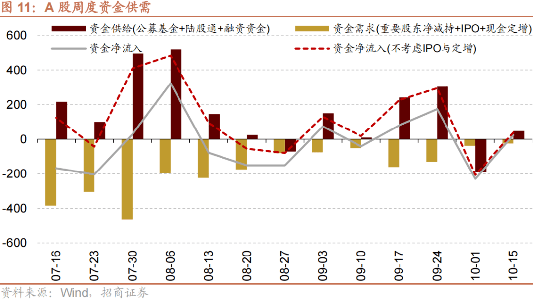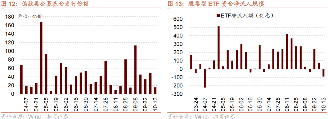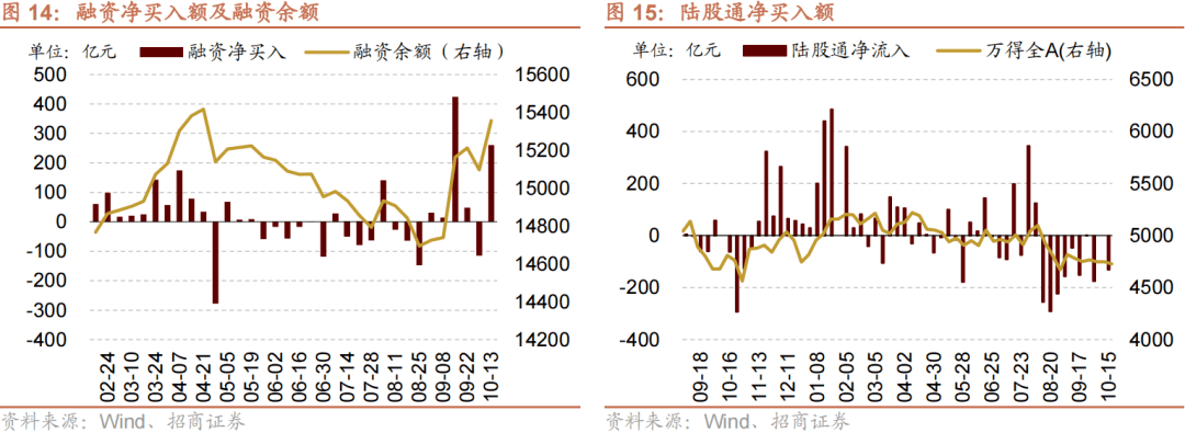 资金供给方面,上周(10/9-10/13)新成立偏股类公募基金15.6亿份,较前期减少33.8亿份。股票型ETF较前期净流出,对应净流出88.0亿元。上周整个市场融资净买入260.3亿元,从前期净流出转为净流入,截至10月13日,A股融资余额为15357.3亿元。陆股通上周净流出,当周净流出规模为131.4亿元,净卖出额较前期收窄43.8亿元。