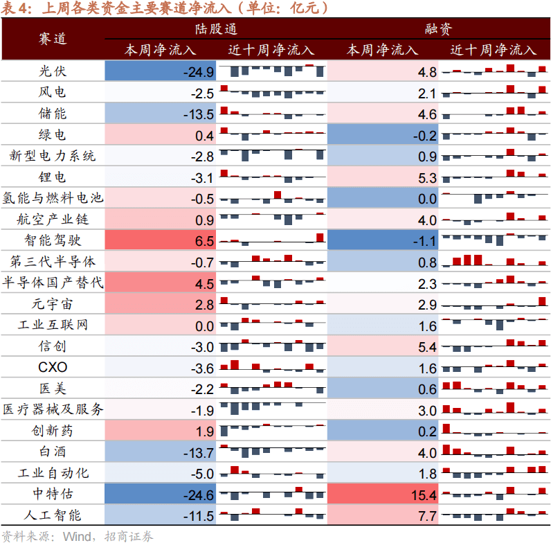 赛道偏好上,上周(10/9-10/13)北上资金净流入规模较高的为智能驾驶(6.5亿元)、半导体国产替代(4.5亿元)、元宇宙(2.8亿元),融资资金净流入规模较高的为中特估(15.4亿元)、人工智能(7.7亿元)、信创(5.4亿元)。