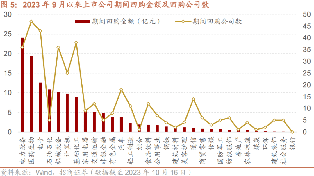 上市公司通过股份回购提升股价,稳定资本市场,以增强投资者信心。当上市公司管理层认为公司股价被低估时,可以通过股份回购传递公司内在价值被市场低估的信息,信号意义大于实际股价拉动作用,若投资者认可则有望导致公司股价上涨,使公司投资价值合理回归,从而提振投资者信心和活跃市场。从行业分布上来,2023年9月以来,上市公司回购主要集中在医药生物、电力设备、电子、计算机等部分TMT行业。