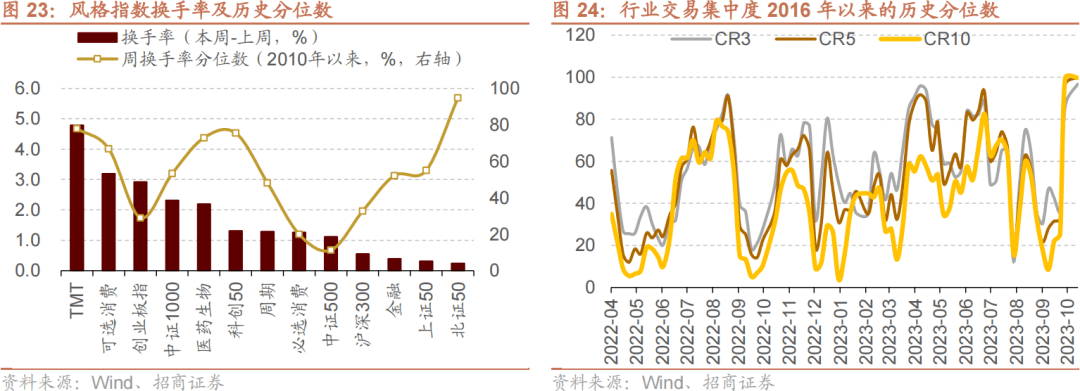 上周(10/9-10/13)关注度相对提升的风格指数及大类行业为TMT、可选消费、创业板指。当周换手率历史分位数排名前5的行业为:北证50(94.8%)、TMT(77.9%)、科创50(75.5%)、医药生物(72.9%)、可选消费(66.9%)。