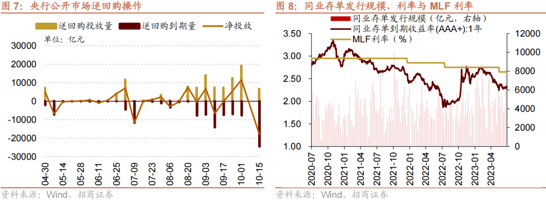 上周(10/7-10/13)央行公开市场净回笼17810亿元。为维护银行体系流动性合理充裕,央行开展逆回购6660亿元,同期有24470亿元央行逆回购到期,本周将有6660亿元逆回购、500亿元国库现金定存到期。10月16日,央行开展7890亿元1年期MLF操作,利率持平,相比本月到期规模将净投放2890亿元,超额续作净投放规模相比上个月的1910亿元明显扩大,显示货币政策端仍在持续发力,呵护市场流动性稳定。