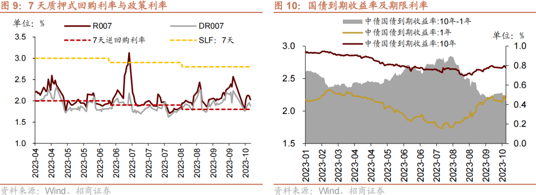 货币市场利率下行,R007与DR007利差缩小;短端国债收益率上行,长端国债收益率下行,期限利差缩小。截至10月13日,R007为2.03%,较前期(9月28日)下行54.1bp,DR007为1.88%,较前期下行35.2bp,两者利差缩小18.9bp至0.14%。1年期国债到期收益率上升1.0bp至2.18%,10年期国债到期收益率下降0.5bp至2.67%,期限利差缩小1.5bp至0.49%。