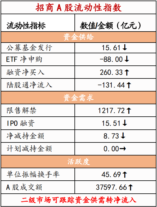 ⚑ 资金供需:二级市场可跟踪资金转净流入。北上资金流出,净流出131.4亿元;融资余额上升,融资资金净买入260.3亿元;ETF净流出88.0亿元;新成立偏股类公募基金份额减少。重要股东净减持规模下降,公布的计划减持规模与上期持平。