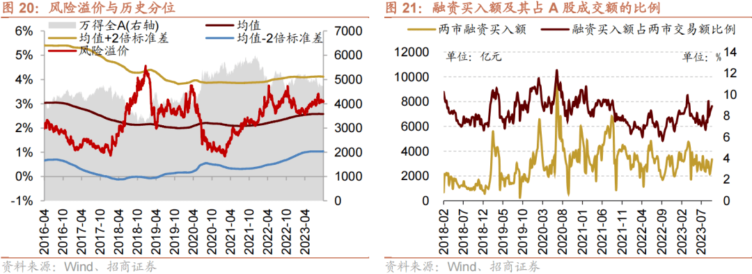 上周(10/9-10/13)融资买入额为3350.8亿元;截至10月13日,占A股成交额比例为8.9%,较前期上升,融资资金交易活跃度增强,股权风险溢价上升。
