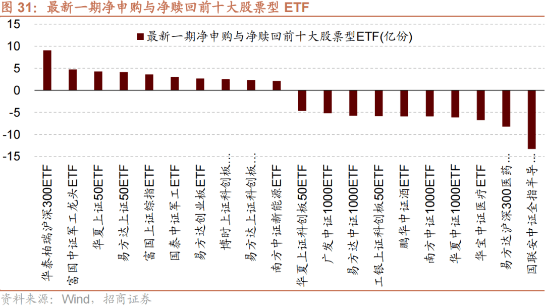 上周(10/9-10/13)股票型ETF净申购规模最高的为华泰柏瑞沪深300ETF(+9.1亿份),富国中证军工龙头ETF(+4.8亿份)净申购规模次之;净赎回规模最高的为国联安中证全指半导体ETF(-13.3亿份),易方达沪深300医药卫生ETF(-8.2亿份)次之。
