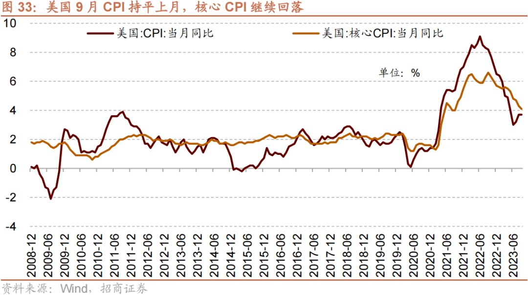 美国9月CPI持平上月,核心CPI继续回落。10月12日,美国劳工部公布的数据显示,美国9月消费者价格指数(CPI)同比上涨3.7%,涨幅与8月持平。数据显示,美国9月CPI环比涨幅为0.4%,较8月0.6%的涨幅略有放缓。剔除波动较大的食品和能源价格后,当月核心CPI同比上涨4.1%,环比上涨0.3%。