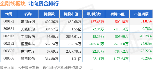 北向资金方面,当日金刚线板块北向资金持股市值为3.69亿元,减持0.27亿元。其中增持最多的是黄河旋风,增持了509.18万元。减持持最多的是高测股份,减持了0.12亿元。金刚线板块北向资金持股变动明细见下表:
