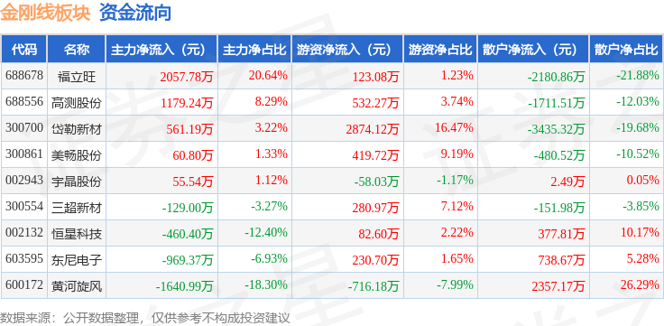 从资金流向上来看,当日金刚线板块主力资金净流入714.79万元,游资资金净流入3769.26万元,散户资金净流出4484.04万元。金刚线板块个股资金流向见下表: