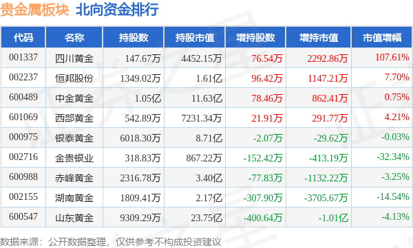 北向资金方面,当日贵金属板块北向资金持股市值为52.53亿元,减持1.08亿元。其中增持最多的是四川黄金,增持了0.23亿元。减持持最多的是山东黄金,减持了1.01亿元。贵金属板块北向资金持股变动明细见下表: