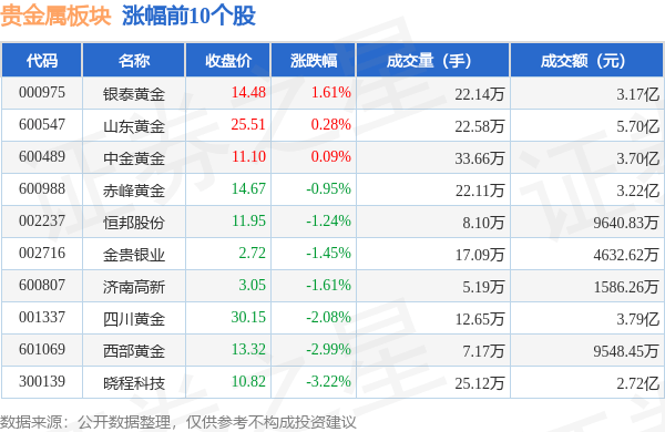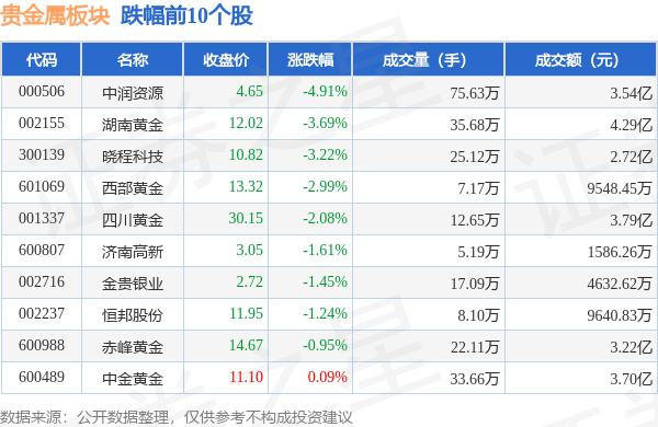 从资金流向上来看,当日贵金属板块主力资金净流出1.2亿元,游资资金净流出27.94万元,散户资金净流入1.2亿元。贵金属板块个股资金流向见下表: