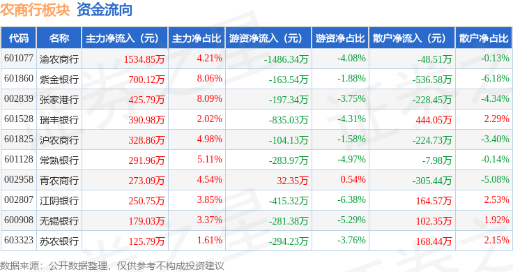 从资金流向上来看,当日农商行板块主力资金净流入4501.21万元,游资资金净流出4028.93万元,散户资金净流出472.28万元。农商行板块个股资金流向见下表: