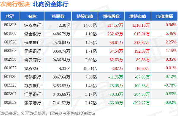 北向资金方面,当日农商行板块北向资金持股市值为54.79亿元,增持0.18亿元。其中增持最多的是沪农商行,增持了0.13亿元。减持持最多的是张家港行,减持了292.27万元。农商行板块北向资金持股变动明细见下表:
