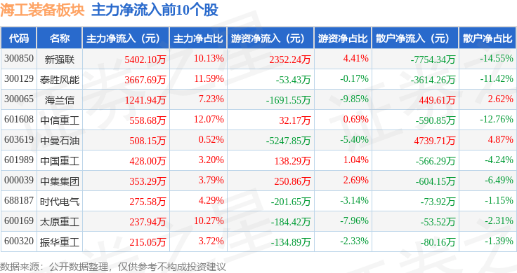 从资金流向上来看,当日海工装备板块主力资金净流出1.03亿元,游资资金净流出2174.83万元,散户资金净流入1.24亿元。海工装备板块个股资金流向见下表: