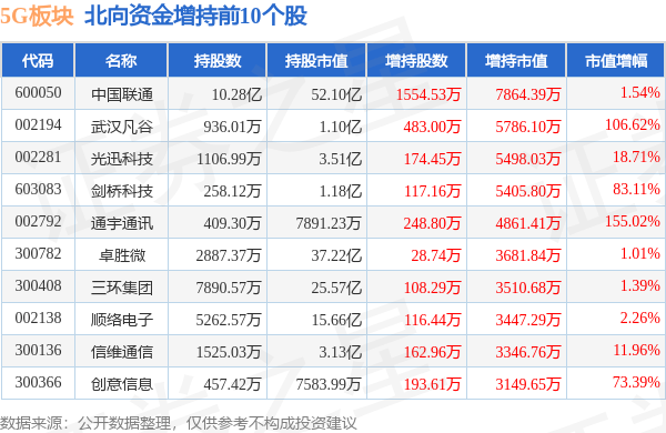 北向资金方面,当日5G板块北向资金持股市值为771.09亿元,减持2.71亿元。其中增持最多的是中国联通,增持了0.79亿元。减持持最多的是天孚通信,减持了1.52亿元。5G板块北向资金持股变动明细见下表: