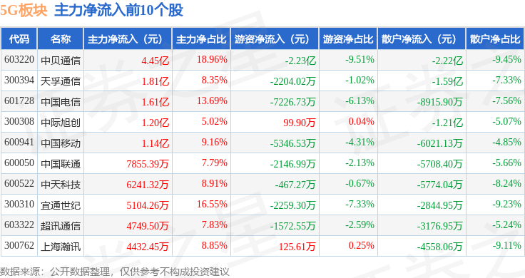 从资金流向上来看,当日5G板块主力资金净流出25.2亿元,游资资金净流入530.95万元,散户资金净流入25.15亿元。5G板块个股资金流向见下表: