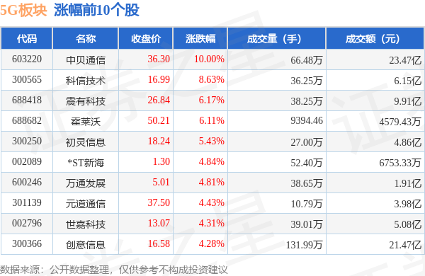 证券之星消息,10月17日5G板块较上一交易日上涨0.07%,中贝通信领涨。当日上证指数报收于3083.5,上涨0.32%。深证成指报收于9940.22,上涨0.15%。5G板块个股涨跌见下表: