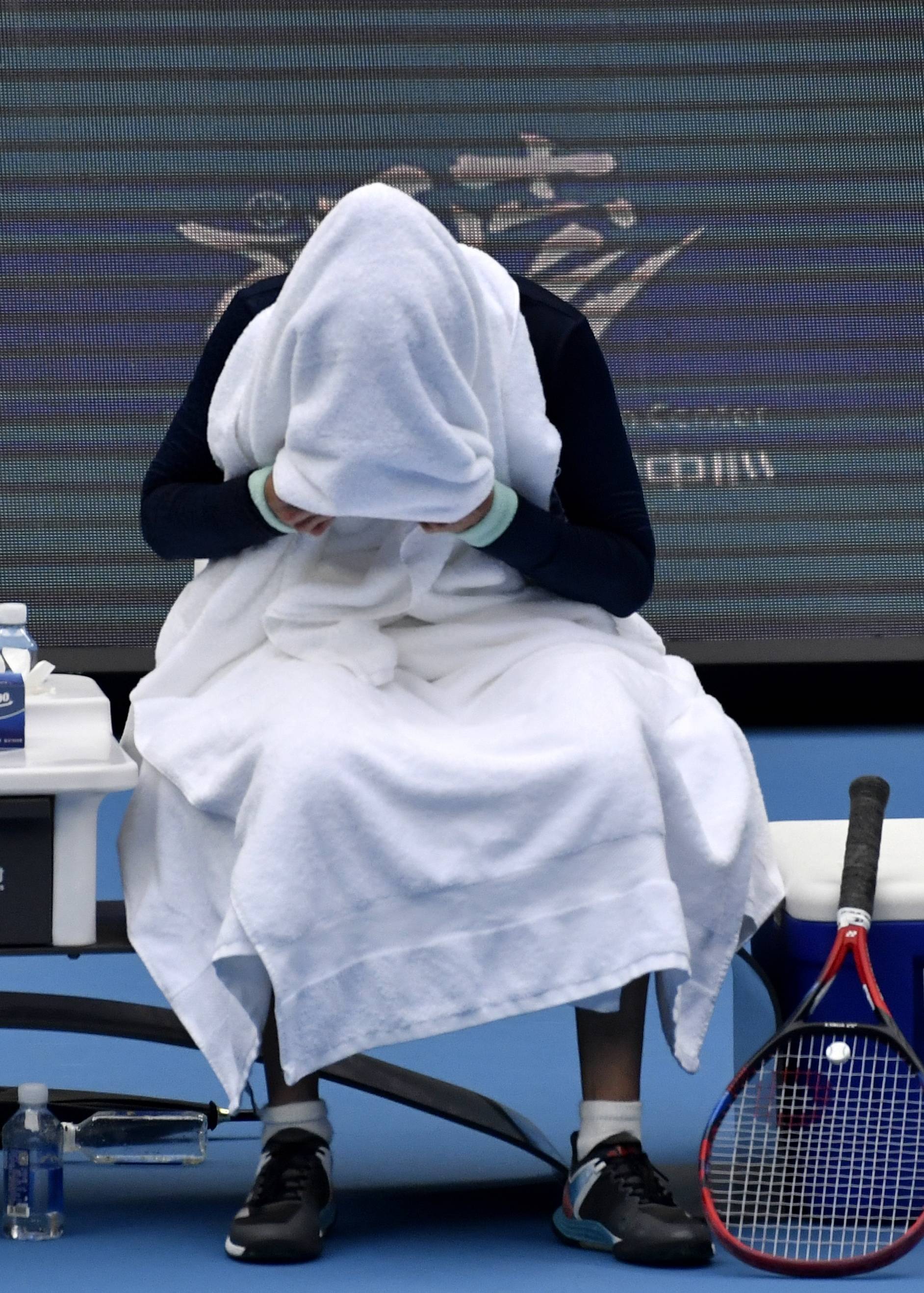 《难掩落寞》10月11日,河南省网球中心中央球场,2023郑州网球赛单打第二轮,从资格赛打起的俄罗斯39岁老将滋沃娜列娃,五天五战,最终不敌乌克兰选手卡利尼娜,无缘八强。图为赛后老将用浴巾深深蒙住头,用纸巾擦拭汗水和泪水,难掩不甘和落寞!周甬 图