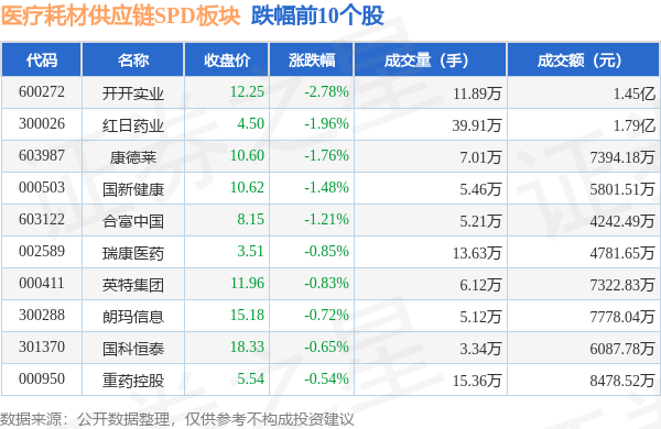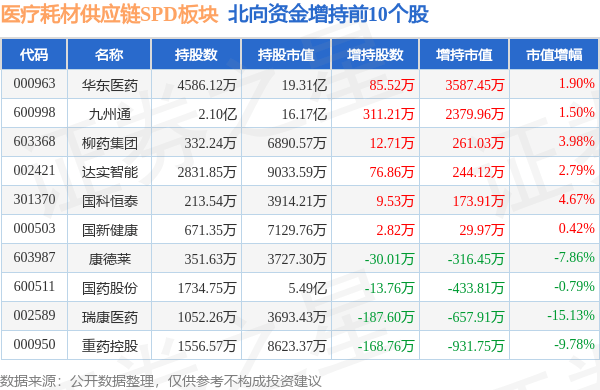北向资金方面,当日医疗耗材供应链SPD板块北向资金持股市值为53.62亿元,减持463.22万元。其中增持最多的是华东医药,增持了0.36亿元。减持持最多的是润达医疗,减持了0.26亿元。医疗耗材供应链SPD板块北向资金持股变动明细见下表: