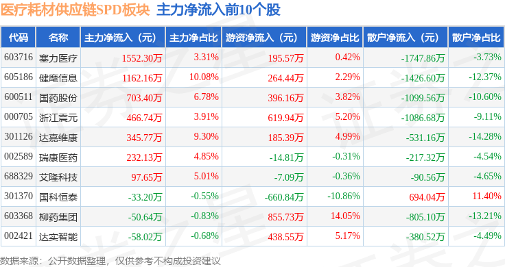 从资金流向上来看,当日医疗耗材供应链SPD板块主力资金净流出2978.26万元,游资资金净流出2851.33万元,散户资金净流入5829.59万元。医疗耗材供应链SPD板块个股资金流向见下表: