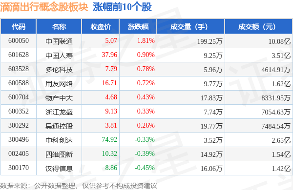 北向资金方面,当日滴滴出行概念股板块北向资金持股市值为177.38亿元,增持0.15亿元。其中增持最多的是中国联通,增持了0.79亿元。减持持最多的是保利发展,减持了0.64亿元。滴滴出行概念股板块北向资金持股变动明细见下表:
