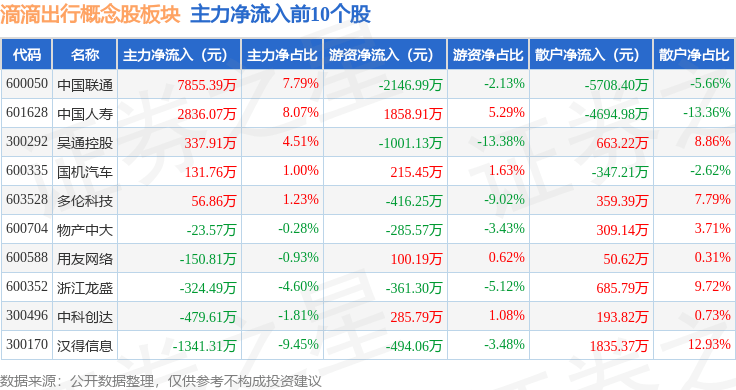从资金流向上来看,当日滴滴出行概念股板块主力资金净流出5341.95万元,游资资金净流出5588.57万元,散户资金净流入1.09亿元。滴滴出行概念股板块个股资金流向见下表: