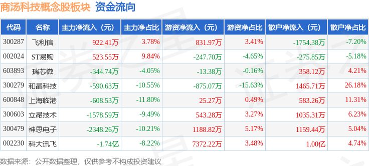 从资金流向上来看,当日商汤科技概念股板块主力资金净流出2.14亿元,游资资金净流入8825.4万元,散户资金净流入1.26亿元。商汤科技概念股板块个股资金流向见下表: