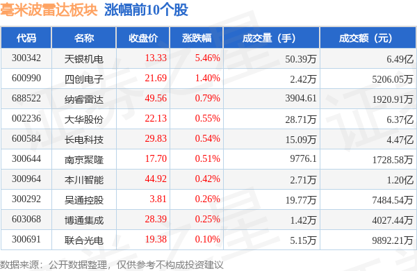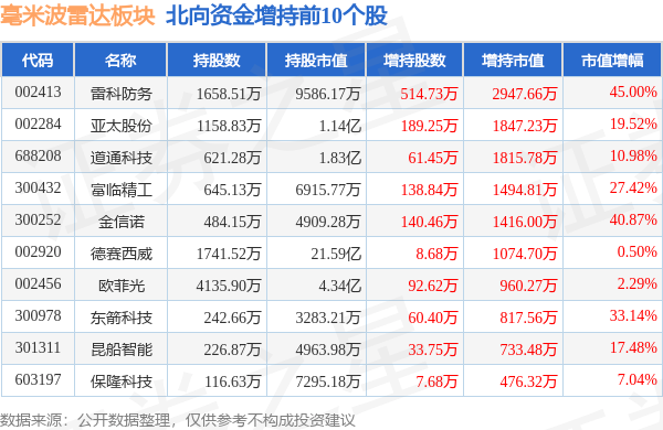 北向资金方面,当日毫米波雷达板块北向资金持股市值为151.45亿元,减持0.26亿元。其中增持最多的是雷科防务,增持了0.29亿元。减持持最多的是大华股份,减持了0.39亿元。毫米波雷达板块北向资金持股变动明细见下表: