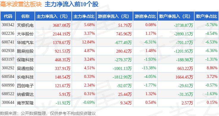 从资金流向上来看,当日毫米波雷达板块主力资金净流出12.64亿元,游资资金净流入3.33亿元,散户资金净流入9.31亿元。毫米波雷达板块个股资金流向见下表: