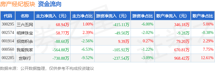 从资金流向上来看,当日房产经纪板块主力资金净流出1256.65万元,游资资金净流出798.68万元,散户资金净流入2055.32万元。房产经纪板块个股资金流向见下表: