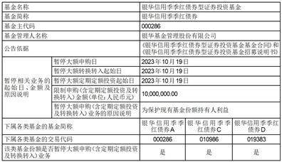 注:本公告就银华信用季季红债券型证券投资基金(基金代码:A:000286;C:010986;D:019383)的大额申购(含定期定额投资及转换转入)业务进行限制,即自2023年10月19日(含2023年10月19日)起单日每个基金账户累计申购(含定期定额投资及转换转入)银华信用季季红债券型证券投资基金A类基金份额、C类基金份额、D类基金份额的合计金额不超过1000万元,若超过1000万元,本基金管理人有权部分或全部拒绝银华信用季季红债券型证券投资基金的申购(含定期定额投资及转换转入)申请。如单日某基金账户单笔申购本基金的金额超过1000万元,本基金有权确认该笔申购失败;如单日某基金账户多笔累计申购本基金的金额超过1000万元,本基金将按申购金额大小排序,逐笔累加至符合不超过1000万元限额的申请确认成功,其余有权确认失败。针对单笔申购业务申请,仅有确认和不予确认两种处理方式,不存在对单笔申请的部分确认。敬请投资者留意。