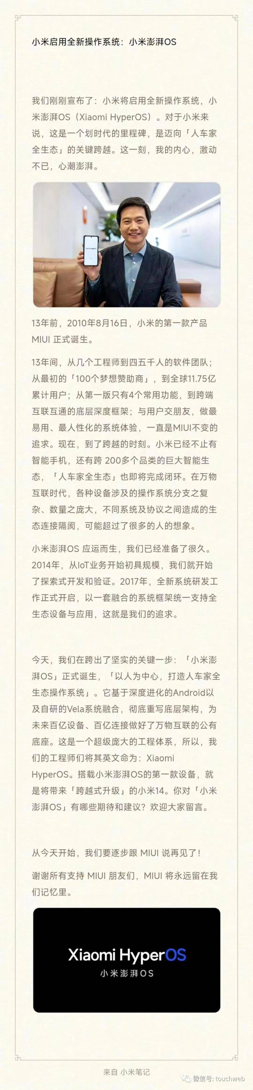 “小米14系列,第一款搭载新系统的手机,已交付工厂,正式开始生产。从这一刻起,小米澎湃OS将逐步接替MIUI。”“从今天开始,我们要逐步跟 MIUI说再见了!MIUI 将永远留在我们记忆里。”