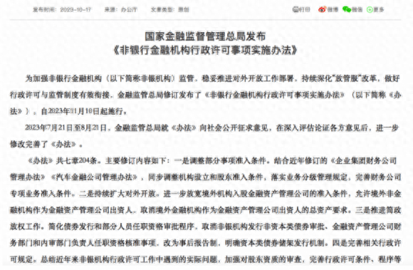 10月17日,记者从国家金融监督管理总局获悉,该局修订发布了《非银行金融机构行政许可事项实施办法》(下称《办法》)。其中,《办法》提到,持续扩大对外开放,进一步放宽境外机构入股金融资产管理公司的准入条件,允许境外非金融机构作为金融资产管理公司出资人,取消境外金融机构作为金融资产管理公司出资人的总资产要求。