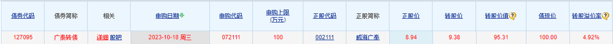 广泰转债对应正股当前的股价为8.94元,转股价为9.38元,转股价值95.31,转股价值一般。对比相似业务已上市可转债的估值以及它当前的转股价值,预估中一签的打新利润约为250元左右,一枚铂金级肉签。