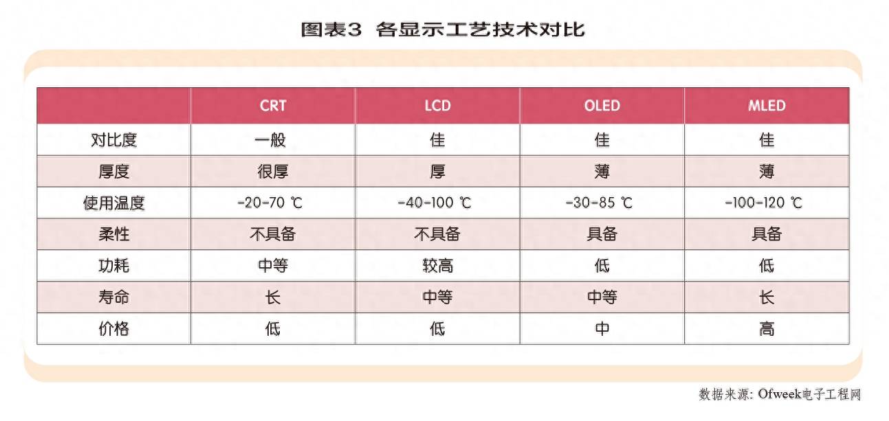 半导体显示行业至少经历3次技术迭代,分别是CRT、LCD、OLED,如今更是开始了新一轮显示技术迭代路线——MLED。MLED实际是小间距LED显示技术,可分为Mini LED和Micro LED,相比上两代显示技术,MLED拥有响应速度快、功耗低、亮度高、色域广、对比度高、可视角度大、寿命长等优势,其中,Mini LED作为高端显示屏的过渡方案,现阶段可以实现量产,但成本比OLED、LCD工艺面板高上许多,导致Mini LED显示屏当下只应用于高端显示领域,而更深一层的Micro LED显示技术现如今还处于探索阶段。(图表3)