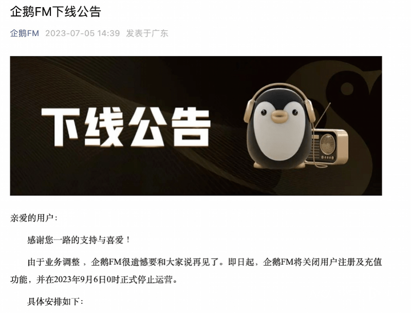 今年7月,在线音频平台企鹅FM发布下线公告,宣布于今年9月6日正式停止运营。企鹅FM于2015年发布正式版,内容包括连载小说、亲子教育等,据赛立信媒介研究所在线音频相关报告,在线音频主流APP中,企鹅FM处于第三梯队。