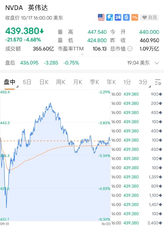 消息面上,美东时间10月17日周二,美股芯片股全线走弱,龙头英伟达一度重挫近8%,收盘仍录得4.7%的跌幅,报439.38美元/股,市值一夜蒸发超535亿美元(近4000亿元人民币),最新市值1.09万亿美元。