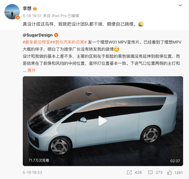 这次发布的理想 MEGA 官图引发热议,不少人认为 MAGA 的造型和此前的渲染图非常相似,而当时李想吐槽这是「跳楼」设计。
