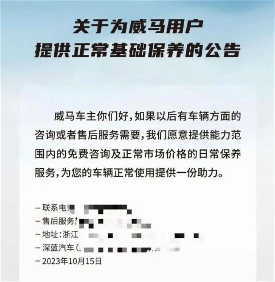 值得一提的是,10月16日,深蓝汽车经销商(长安汽车浙江金华豪邦4S店)发文称将为威马用户提供正常基础保养。该4S店在公告中表示:如果威马车主以后有车辆方面的咨询或者售后服务需要,我们愿意提供能力范围内的免费咨询及正常市场价格的日常保养服务。这被网友们戏称为新能源车企扩局新思路。对此,深蓝汽车内部人士表示,“该信息属实,但为深蓝汽车浙江某经销商独立行为,并非深蓝汽车官方行为。”