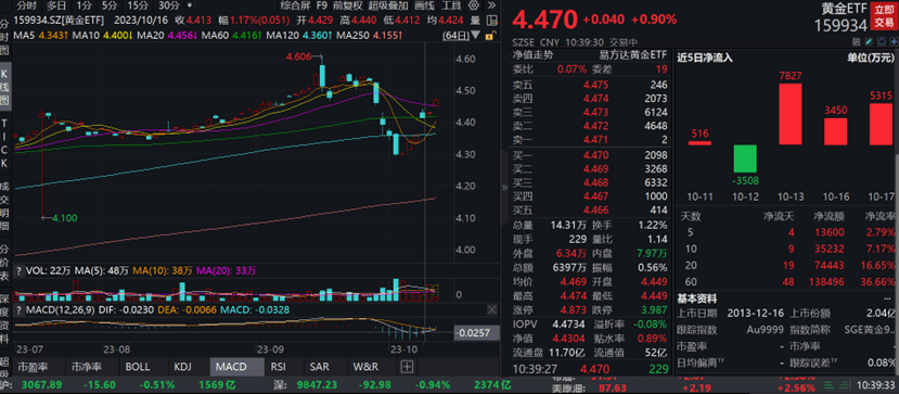 黄金 ETF(159934)追踪上海黄金交易所的Au99.99 ,融资融券信息显示,该基金2023年10月17日当日融资买入1.25亿元,融资偿还5574.5万元,融资净买入6886.18万元;融资余额124.35亿元,较前一日增加0.56%。