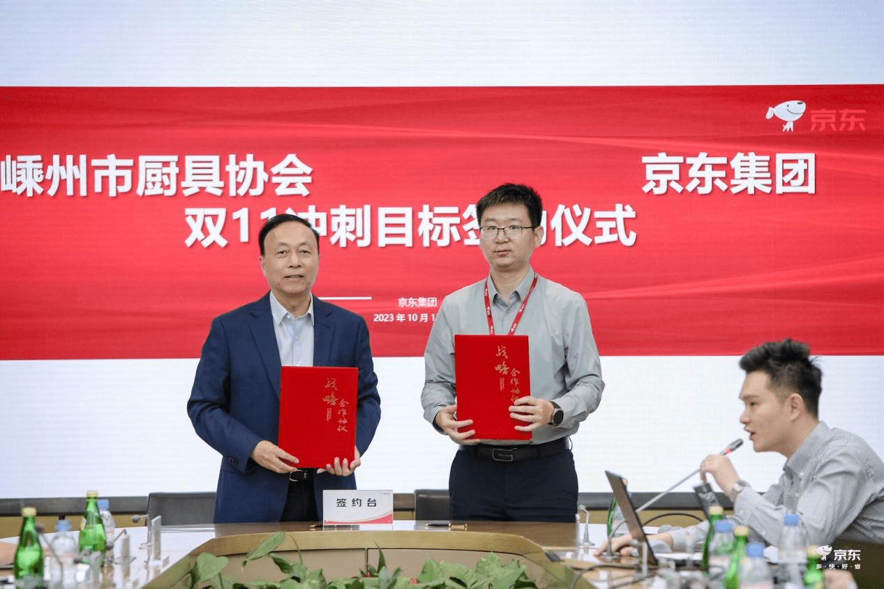 会议现场,京东冰洗厨卫业务部与嵊州厨具行业协会签订《京东与嵊州集成厨电产业2023年11.11冲刺目标协议》。京东家电与嵊州集成厨电产业带共同冲刺本次京东11.11销售,力争再创11.11销售新高。