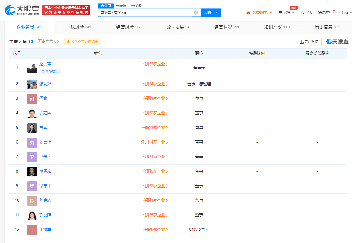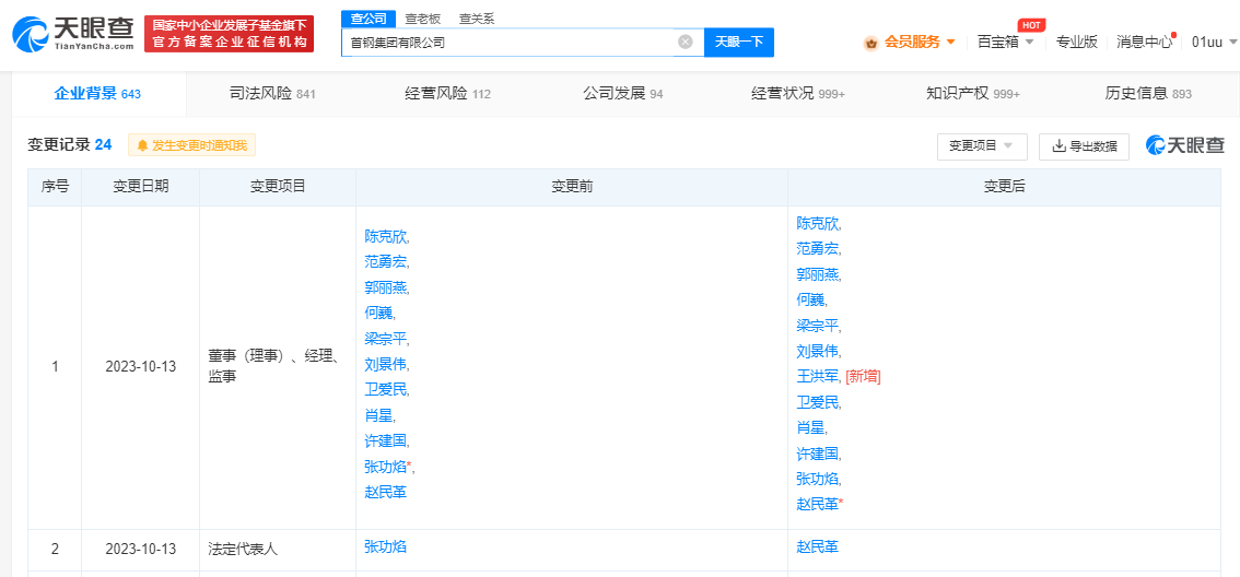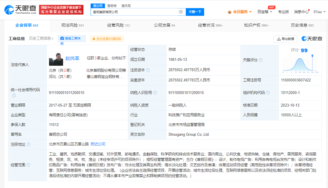 天眼查App显示,近日,首钢集团有限公司发生工商变更,张功焰卸任法定代表人、董事长,由赵民革接任。该公司成立于1981年5月,注册资本约287.55亿人民币,经营范围包括工业、建筑、地质勘探、交通运输、对外贸易、邮电通讯、金融保险、科学研究和综合技术服务业等,由北京国有资本运营管理有限公司全资持股。