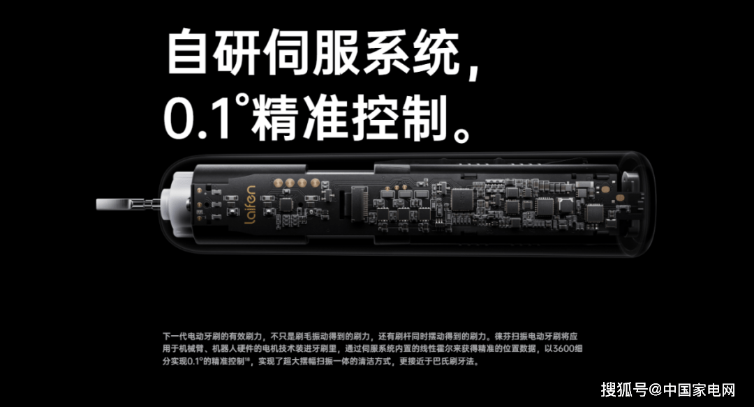 在强劲动力方面,徕芬电动牙刷搭载自主创新的电机伺服系统,将传统的开环式电机升级为闭环式电机,刷头的工作情况将反馈给电机,在遇到阻力等干扰因素时,通过算法改变功率大小,保持刷头的稳定工作。并且,传统的盘式电机、线性电机、磁悬浮电机只能做到刷头的扫动或者震动,而徕芬电机做到了大振幅扫振一体,在振动的同时上下扫动,在保证清洁力的同时符合巴氏科学刷牙法。