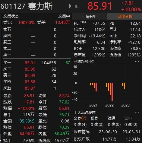 上证报中国证券网讯 10月18日尾盘,赛力斯涨停,实现9天5板,成交额超95亿元。