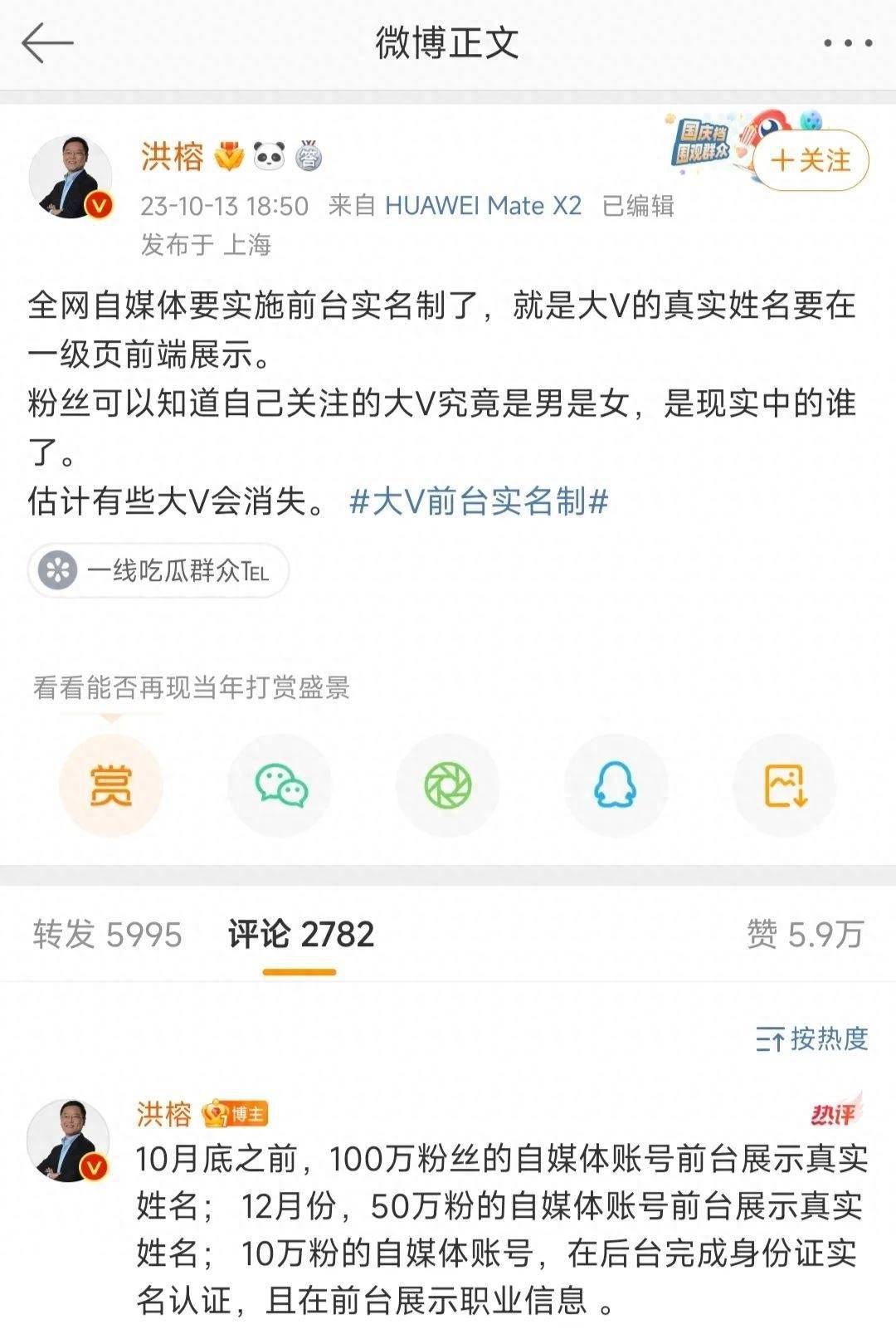 次日,洪榕还补充道:“10月底之前,100万粉丝的自媒体账号前台展示真实姓名;12月份,50万粉的自媒体账号前台展示真实姓名;10万粉的自媒体账号,在后台完成身份证实名认证,且在前台展示职业信息 。”