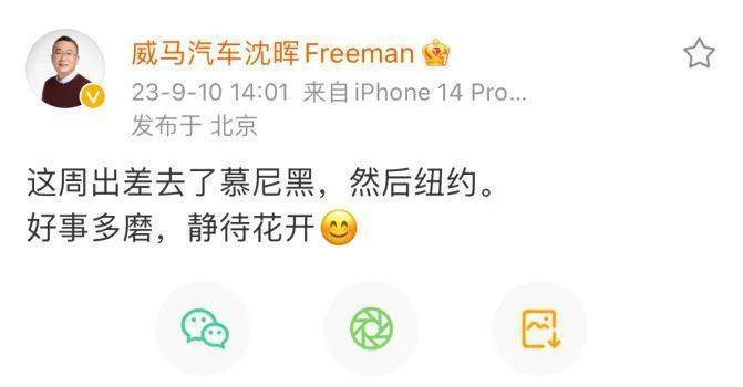 近期有消息称,伴随公司严重的经营危机,威马创始人沈晖借口参加德国慕尼黑车展,随后转机直飞美国纽约,远走海外,一去不归。此前发布地址一直显示为北京的沈晖,在9月10日发布微博称:“这周出差去了慕尼黑,然后纽约。好事多磨,静待花开。”不过,该条博文发布地址仍为北京,截至10月9日,沈辉发布的每条博文显示发布地址也均为北京。